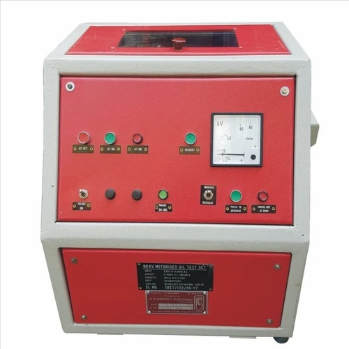 Semi-automatic transformer oil BDV test machine, available in 60-120 KV capacity. Red & White powder coated finish. Made in India for industrial use.