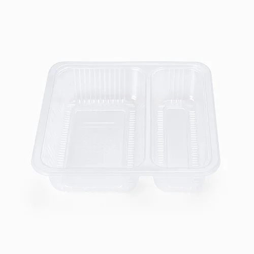 Transparent, disposable plastic food packaging tray. Size 26 x 22 x 4.4 cm. Made in India. Minimum order 10,000 pieces.