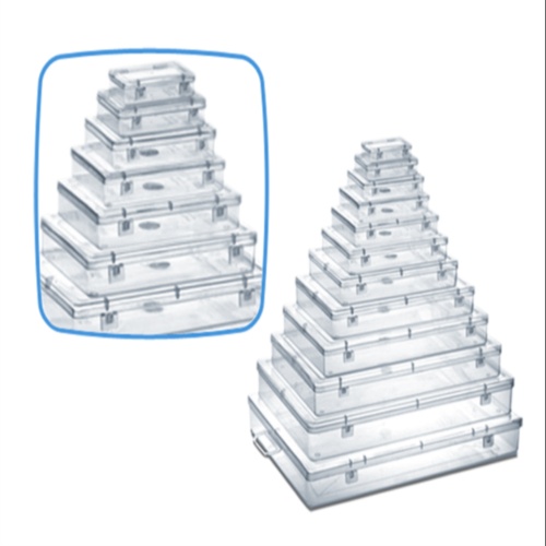Transparent rectangular plastic box, Series 66. Dimensions: 120 mm length, 200 mm width, 27 mm height. Plain pattern, clear plastic material.