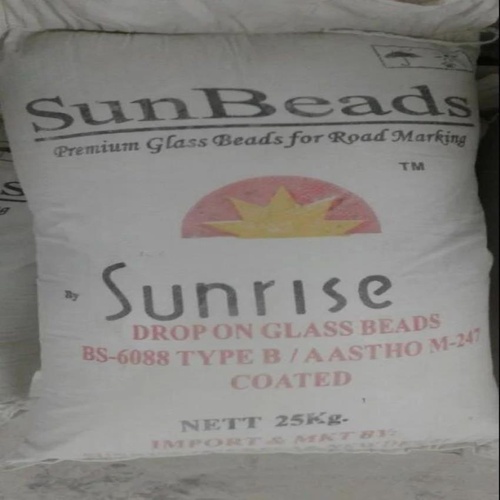 Transparent, round glass beads sized 0.1 to 0.5. Packaged in a 25 kg bag, with micron sieve size.