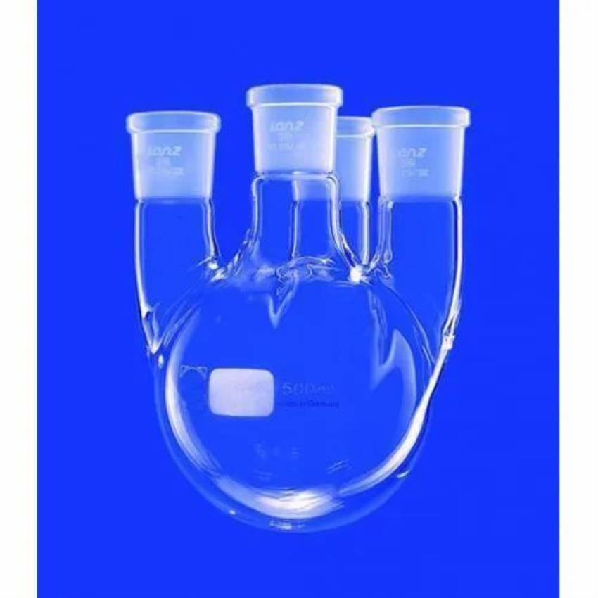 Transparent spherical vessel with four necks and a bottom outlet. Ideal for chemical laboratory and industrial applications.