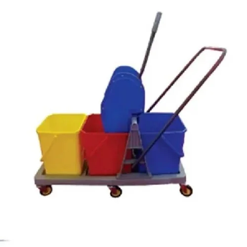 Commercial-grade triple bucket wringer trolley made of plastic. Ideal for professional use, offering enhanced capacity for cleaning tasks. Features a durable yellow construction.