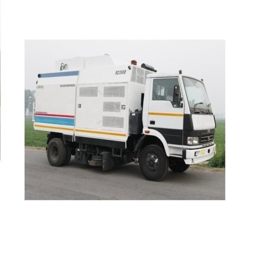 Truck mounted sweeping machine with 1500 m2/hr coverage. Features 100 L hopper capacity, 500 mm sweeping width, and 50 L water tank. 600 Watt rated input power.