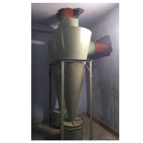 Two-stage twin cyclone dust collector, mild steel construction. 5 HP motor, 1650 m3/hour airflow, 250 Kg bag capacity. Ideal for flour dust.