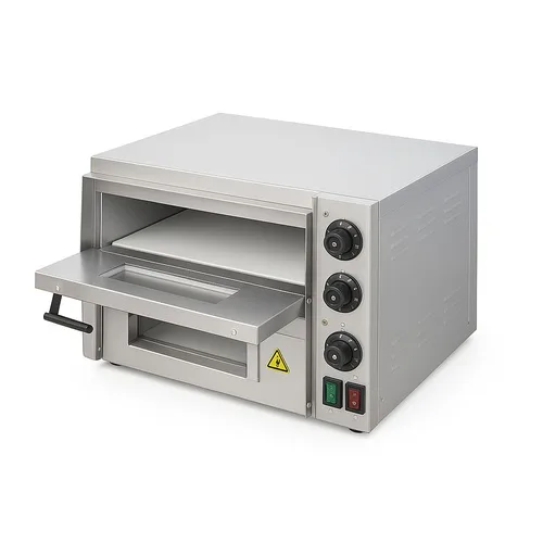 Manual two deck electric machine for pizza baking in bakeries and commercial settings. ISO certified, large size, for hotels and restaurants.