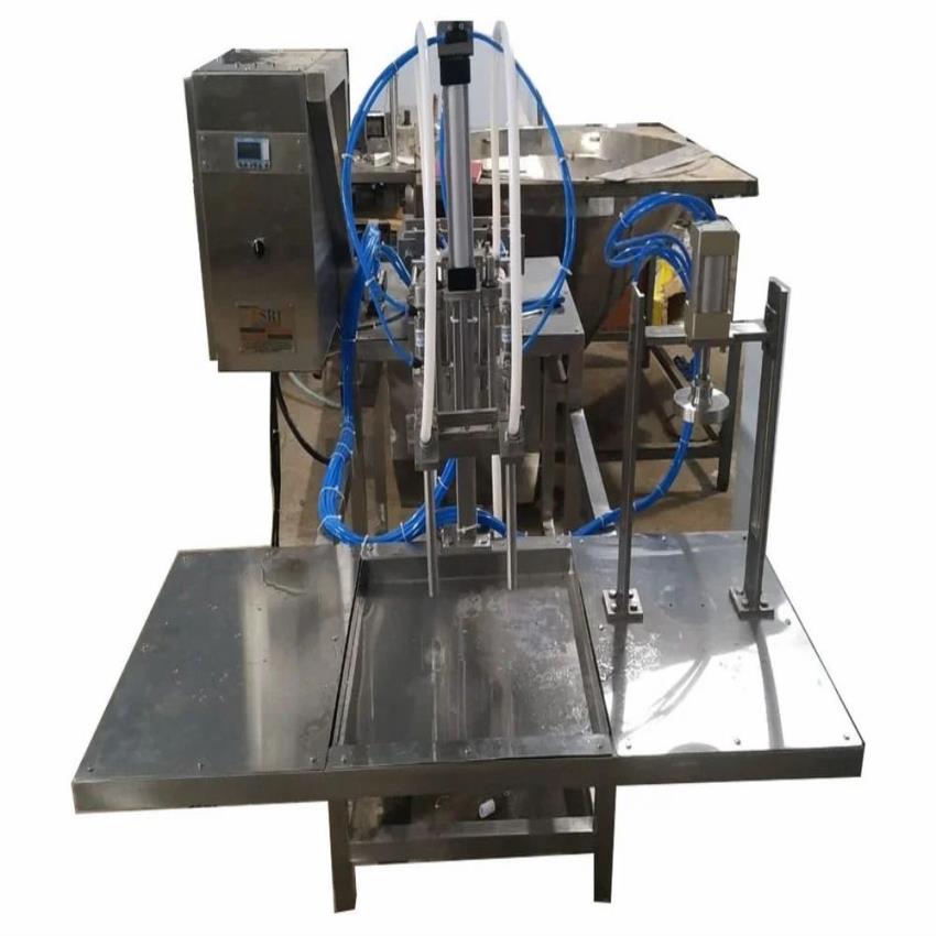 Single-phase electric Two-Head Volumetric Liquid Filling Machine. Stainless steel construction for liquid application. 200 bottle/min capacity. 220V, 50Hz, 1KW.