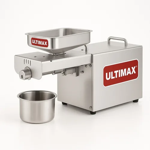 Electric oil maker machine, 750 Watts, Stainless Steel. Produces 4-6 Kg oil from various seeds without chemicals. Compact, portable design with 2-year motor warranty.