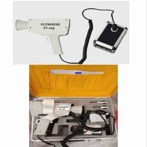 Industrial speed radar machine with 0.1 RPM resolution. Mild steel construction, portable size, and white color. Model YT10P for industrial applications.