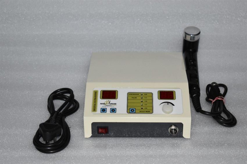220V ultrasound machine with 1MHz & 3MHz frequencies. Offers 0-99 min treatment time, 3.5 Watt/cm2 power, and continuous/pulsed modes. 11 Pulse Duration.