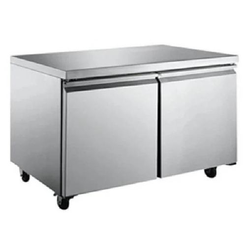 Double door under counter refrigerator. Compact design for commercial use. Provides reliable cooling for food and beverages in a limited space.