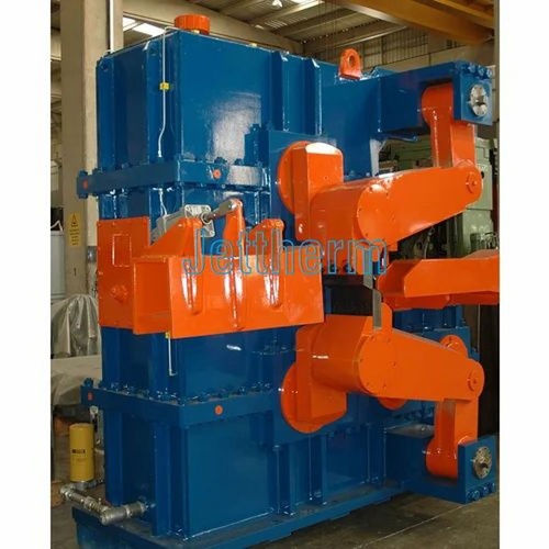 Universal flying shear, electric powered with 50 Hz frequency. Features a color-coated surface finish for industrial use. Designed for versatile cutting tasks.