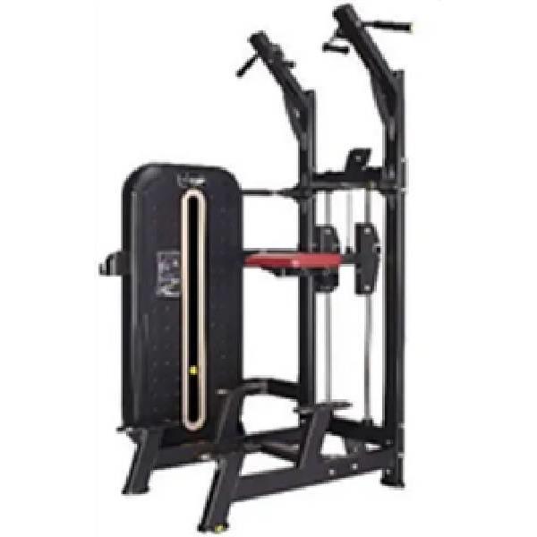 Commercial assisted chin dip machine for upper body training. Features a 100 KG weight stack for resistance. Constructed from mild steel for gym use.