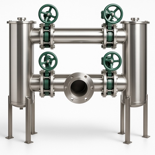 UPVC glass fiber duplex cartridge filter. Available in 1"-4" connection, 5-50 m³/hr flow rate, up to 10 bar pressure, and 60°C temperature.