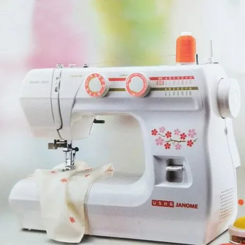 Usha Janome Wonder Stitch automatic zig zag machine operates at 860 stitches per minute. Offers 8 built-in stitches for versatile sewing. Automatic needle threading simplifies setup. Compact and efficient for home use.