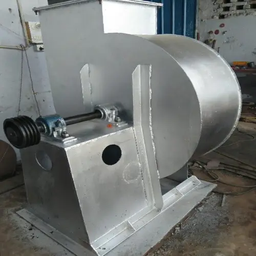 Mild steel V-belt driven induced draft fan for industrial use. Variable fan speed from 1400 to 1600 rpm. Capacity ranges from 10hp to 60hp.