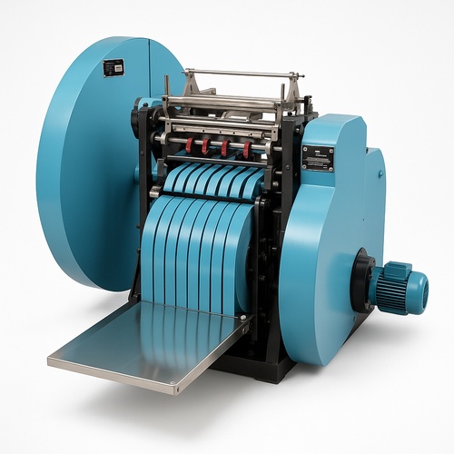 Semi-automatic V-bottom paper bag making machine. Kraft paper compatible. MS body, 28 HP motor, 12000 pieces/hour capacity. Operates on 220-240V, 50-60 Hz.