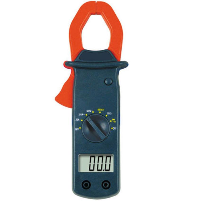 Digital clamp meter with variable specifications for DC voltage, AC/DC current, and battery type. Features a general model name. Offers basic electrical measurement capabilities.