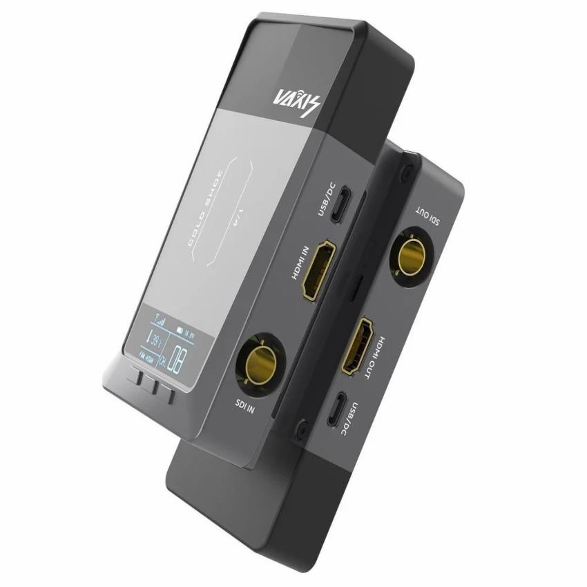 Vaxis Atom 500 wireless video transmitter with SDI and HDMI input. Features 500 Ft. range and 0.008 sec delay. Requires external battery for power.