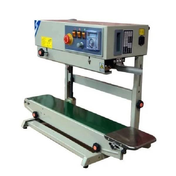 Semi-automatic vertical band sealer, model VBand02. Constructed from mild steel, it seals plastic packets at 60 pouches/min, with a production capacity of 2500-3000 pouches per hour.