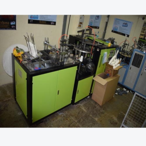 Automatic, three-phase paper cup making machine manufactured in India. Weighs 2500 kg and includes a 1-year warranty. Operates on 50 Hz frequency.