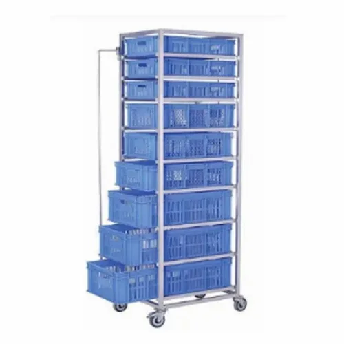 SS vegetable crate trolley with 101-150kg load capacity. Polished finish, silver color, and 4 wheels. Made in India for robust use.