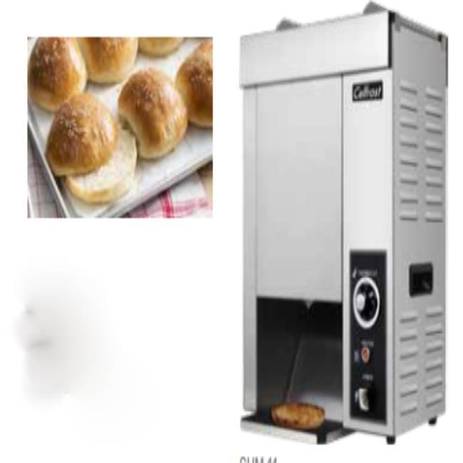 Vertical bun toaster equipment. Dimensions 460 x 350 x 610 mm. Operates on 220V/50Hz/1Ph with 2 KW power. Net weight: 13 kg.