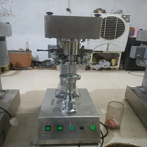 Semi-automatic vertical seal machine in M.S. material, with 0.5 HP motor. Seals cans up to 100mm diameter. Capacity of 500 cans per hour. Made in India.