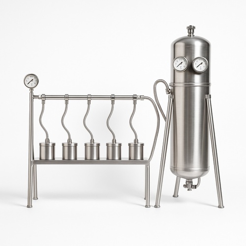 Vertical stainless steel permeability testing machine for laboratories. Offers capacities of 2, 4, 6, or 12 units. Hand-powered, weighs 100-120kg.