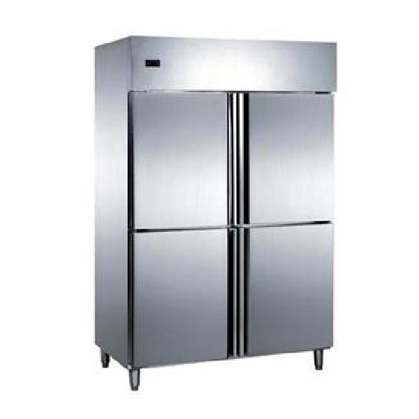 This vertical refrigerator features four stainless steel doors and an upright design. With a 1200L capacity, it offers substantial storage space and is powered for efficient operation.