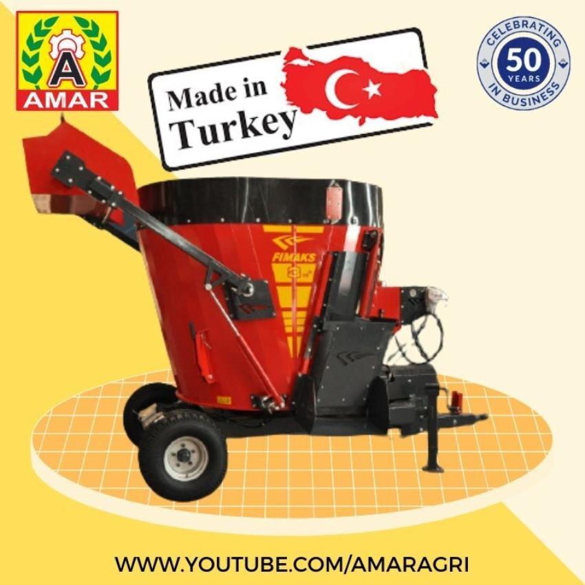 This 3 cubic meter vertical mixer feeder features a 30 hp motor and is constructed from mild steel. It is portable and designed for tractor power source. Standard design, orange color.
