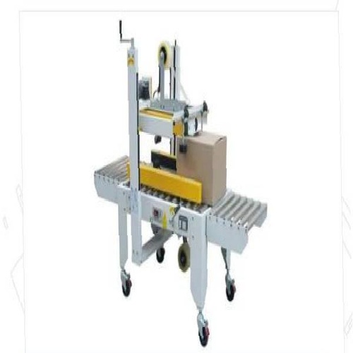 This vertical taping machine accommodates 2-inch tape. Designed for efficient application in packaging processes. Reliable performance for standard taping requirements.
