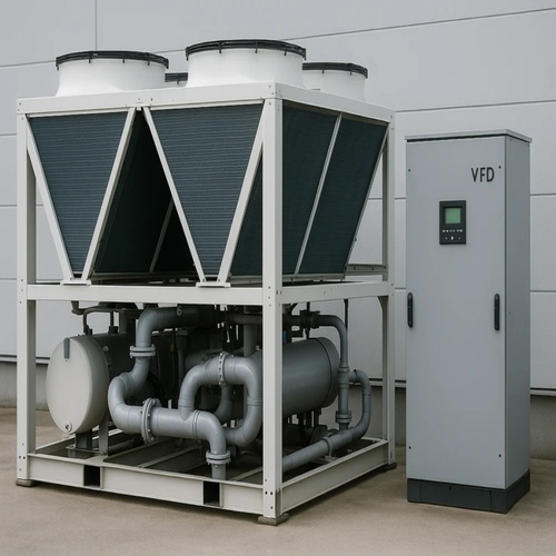 Variable Frequency Drive Chiller with 3 Phase input, 50/60 Hz. Features Vector Control, 150% start-up torque at 0.5 Hz, and adjustable acceleration from 0.1-600 seconds.