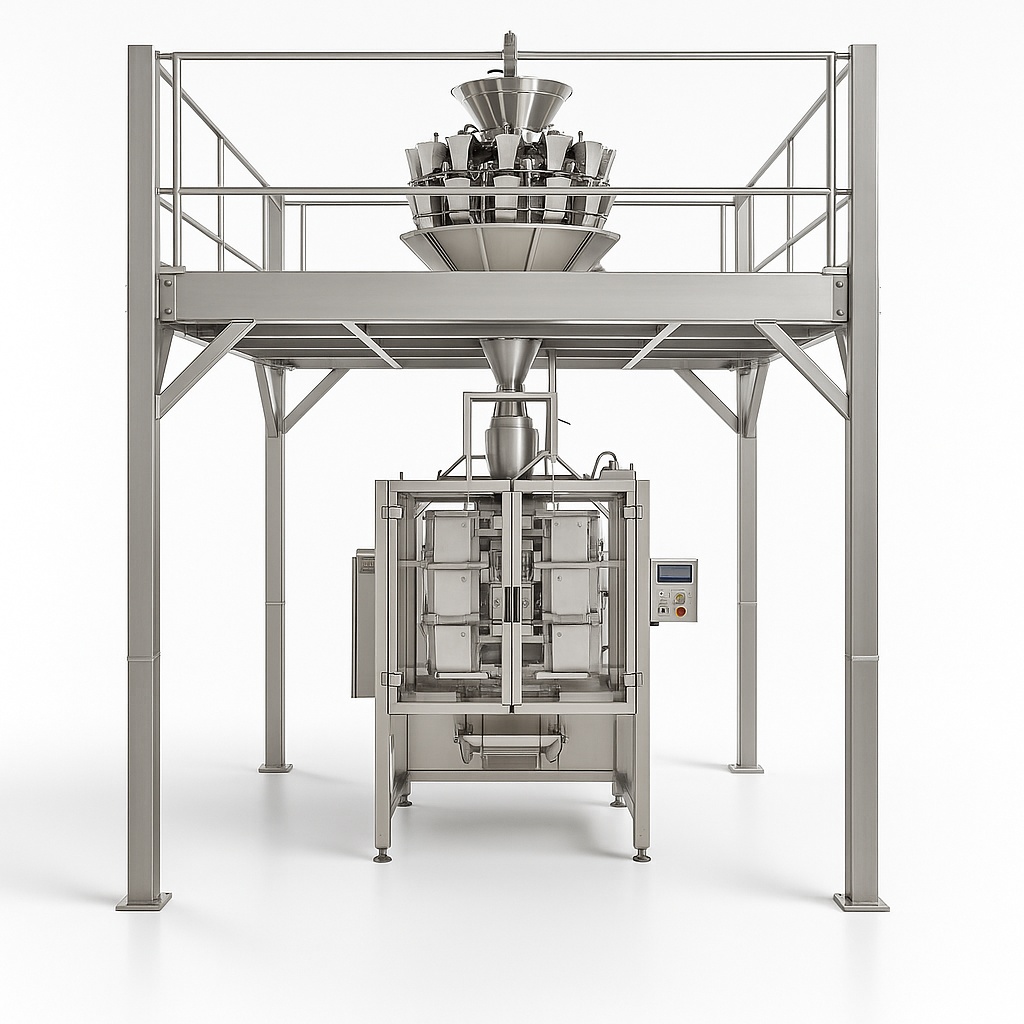 High-speed VFFS pouch packing machine with multi-head filling system for efficient and accurate product packaging. Designed for versatile pouch formats.