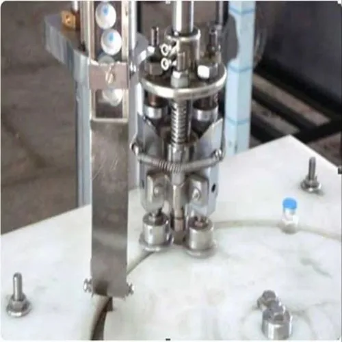 Automatic stainless steel vial sealing machine. Operates on 220V, featuring induction seal technology. Suitable for wooden/babool packing applications.