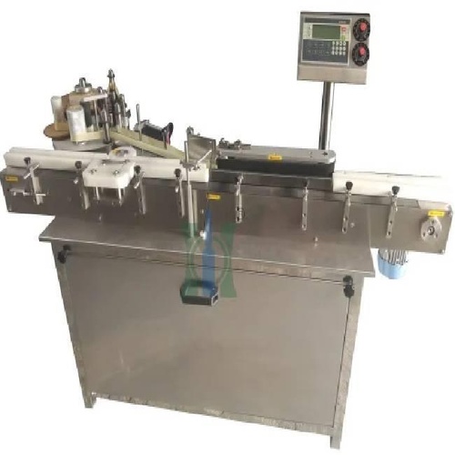 Automatic vial labeling machine constructed from SS material, operating on 320V, 50 Hz, 3-phase power. Suitable for industrial sticker application needs.