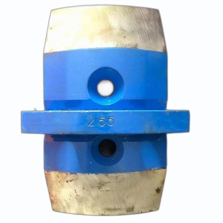 Mild steel mounting plate for vibrating machines, 5 inches long. Features a blue and off-white paint-coated surface finish. Material grade S355JR.