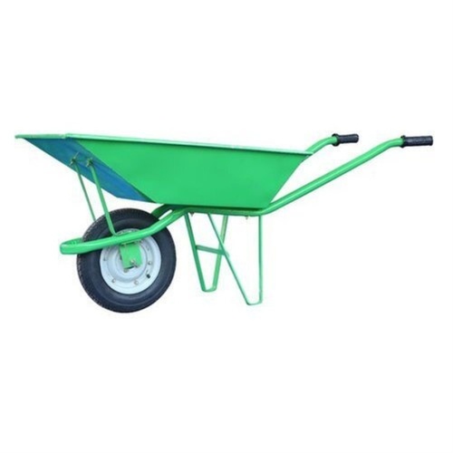 Single wheel barrow for construction. 150 capacity, green color. Model 141. Manually operated for efficient material transport.