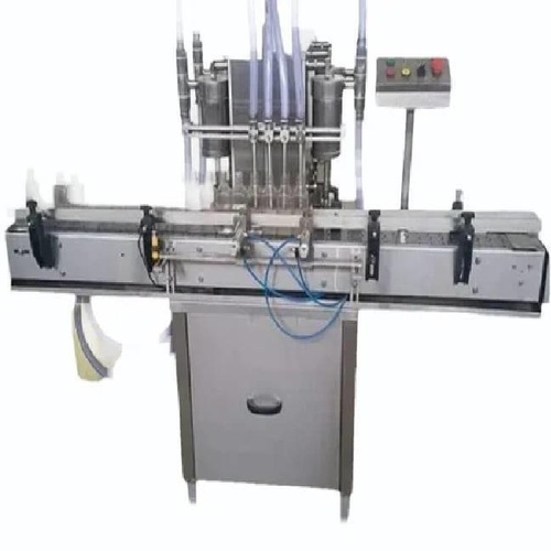 Automatic volumetric liquid filling machine with 30-40 BPM capacity. Fills 100ML to 1000ML bottles. 1.75KW power consumption. User-friendly operation. Size: 6x3x4 ft.