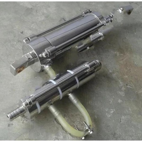 Industrial volumetric syringe pump for shampoo filling. Stainless steel construction (SS 304/316), polished finish. Fills 10 ml to 1000 ml, capacity up to 25 fills/min.
