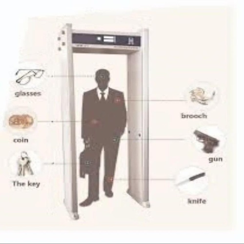Walk Through Metal Detector Machine with in-built IR sensors, sensitivity adjustment, and walk/stop indicator. Features rechargeable batteries for continuous operation.