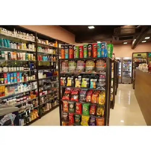 Free-standing 7-foot wall display rack with 7 shelves. Constructed from mild steel, it supports 250 Kg. Ideal for showroom applications.