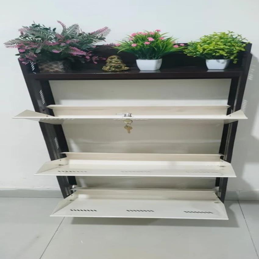 Powder coated alloy steel wall-mount shoe rack with 3 open shelves. Modern white finish. Dimensions: 20"W x 41"H x 6"D. High quality, easy maintenance.