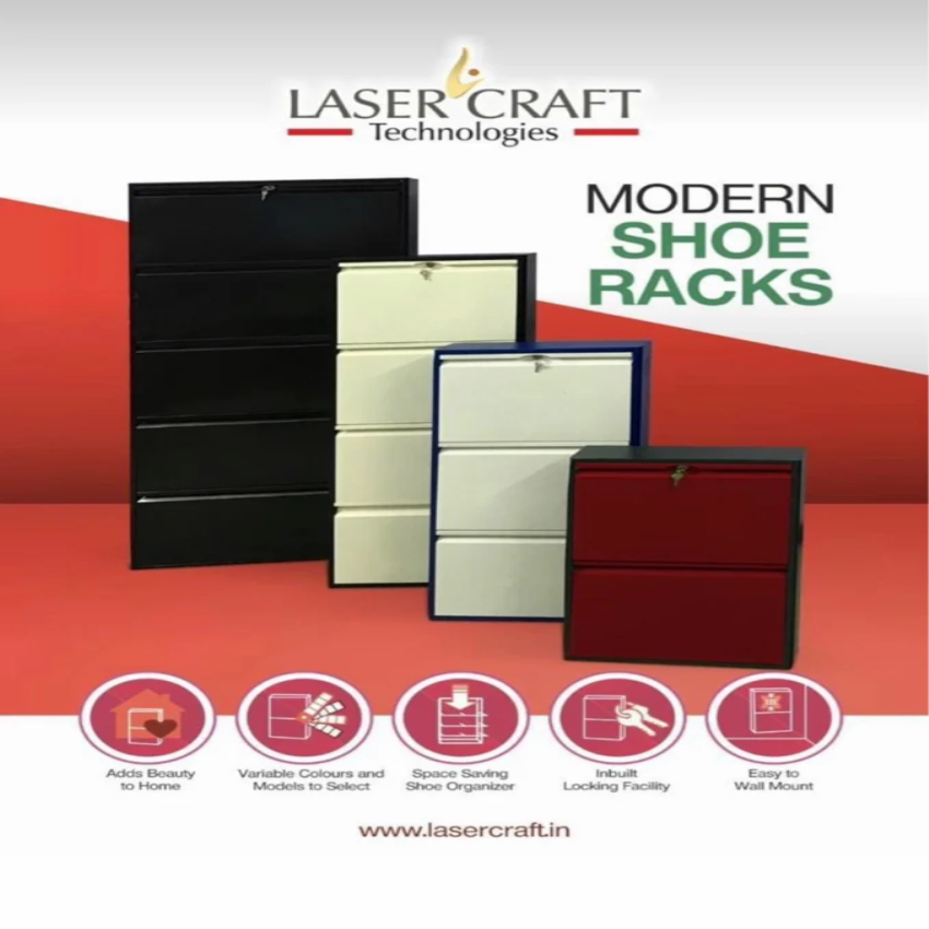 Brown powder-coated mild steel shoe rack. Features 5 shelves for wall mounting. Ideal for new, organized shoe storage. Durable construction for long-lasting use.