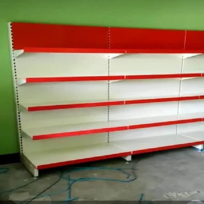 Mild steel 5-shelf wall side display rack, 6 feet high. Features a polished surface finish. Ideal for departmental stores. Free-standing unit.