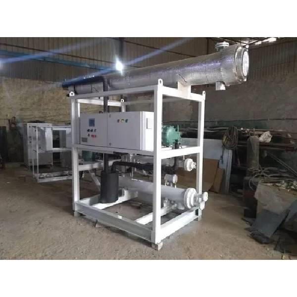 Automatic water cooled brine chiller device, 1-400 TR capacity. Mild steel construction, 415V voltage. Operates from 4°C to -50°C ambient. Uses R-22, R404a, R717 refrigerants.