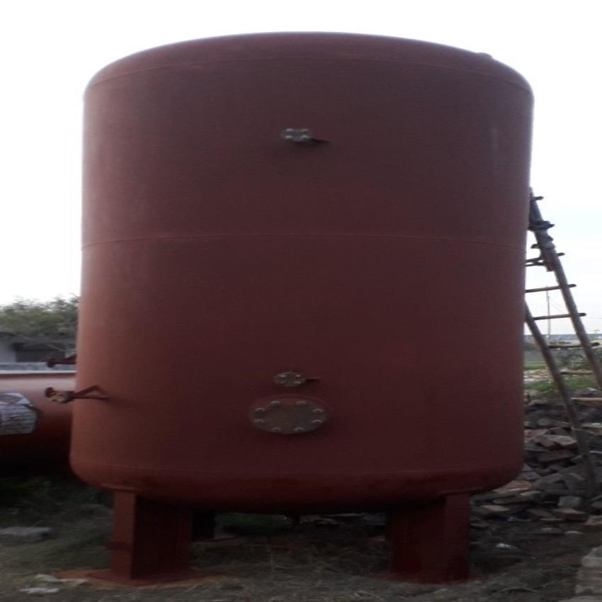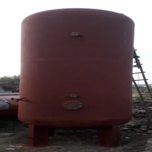 Industrial water storage filter vessel made of Mild Steel, grade IS 2062. Cylindrical shape, available in horizontal and vertical orientations. Max design pressure 0-10 bar.