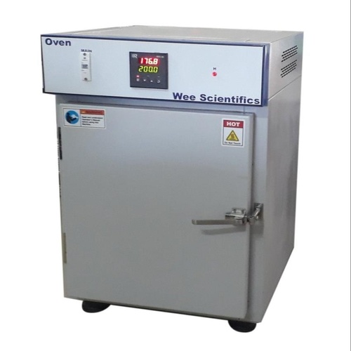 Laboratory hot air oven with 50L capacity and forced air circulation. Features a 50-250°C temperature range, mild steel construction, and powder-coated finishing.