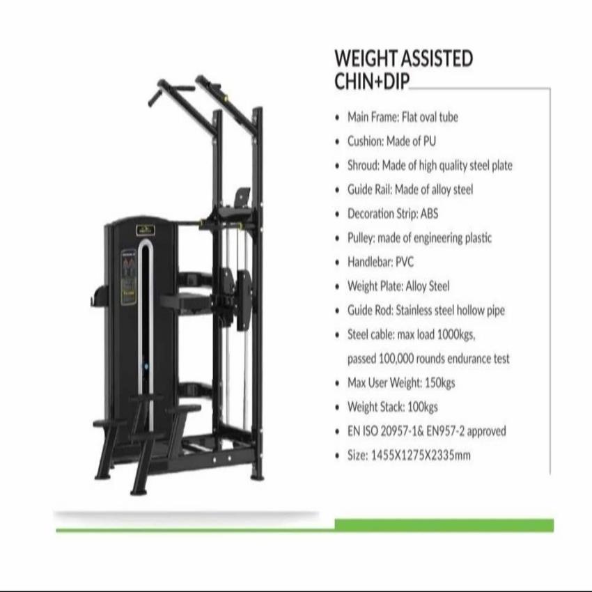 Single station weight assisted chin dip machine with adjustable seat. Features imported heavy-duty cable, SS bearings, and a 100KG alloy steel weight stack.