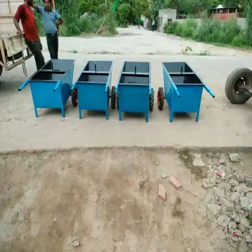 Mild Steel wheelbarrow trolley for construction and industrial use. Features 200 kg load capacity and 100 L volume. Color coated finish.