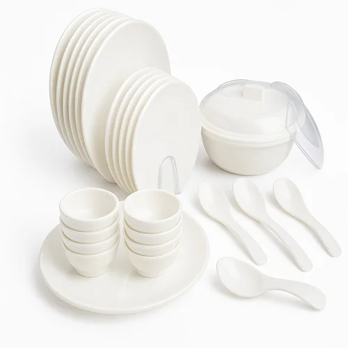 White acrylic crockery set, weighing 5 kg, packaged in a box. Designed for hotel and catering applications. Minimum order quantity: 1 piece.